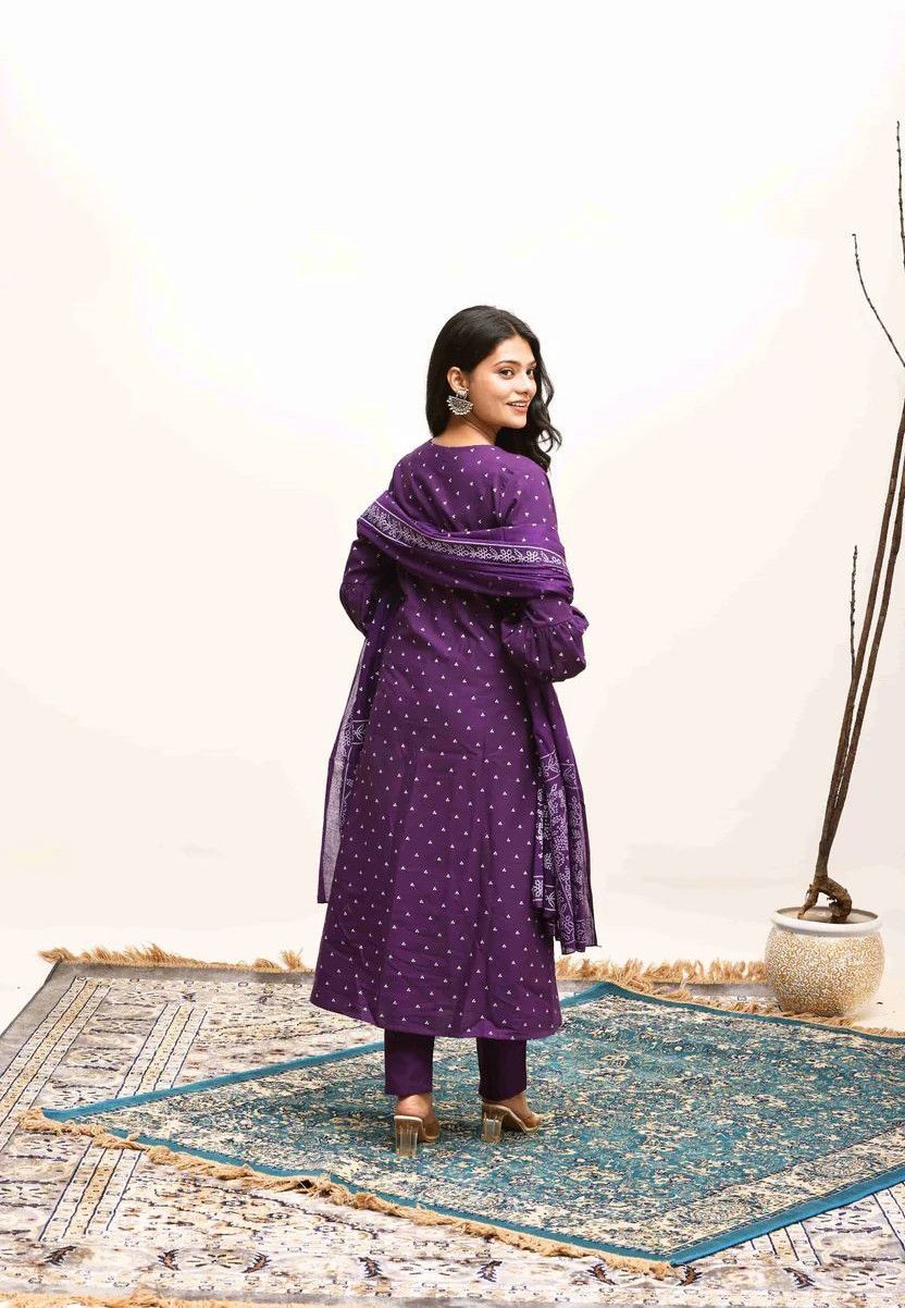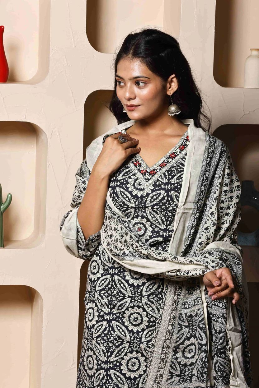 Paired with matching straight pants and a flowy dupatta adorned in complementary prints, this ensemble is perfect for festive evenings, cultural get-togethers, or intimate celebrations. The breathable fabric ensures all-day comfort, while the classic silhouette flatters every body type.